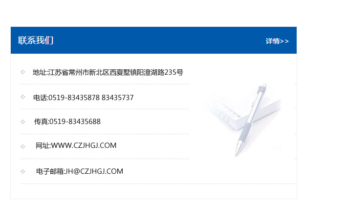 地址:常州市新北區友邦商務大廈1幢16、17層  電話:0519-85101652  傳真:0519-85112595  郵編:213022  網址:www.cz-jiayue_cn.yctalk.com  郵箱:xiajifengaa@163.com